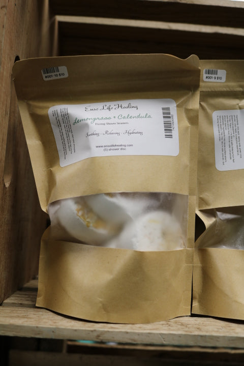 Experience a deep sense of relaxation and tranquility with Enso Life Healing's luxurious Lemongrass and Calendula shower steamers. Enjoy the soothing, fragrant scent of the steamers as you place them safely away from your feet on your shower floor. Let the flow of water activate the steamers and indulge in the perfect escape from the stress of your day. Qty: 5 shower disc per bag