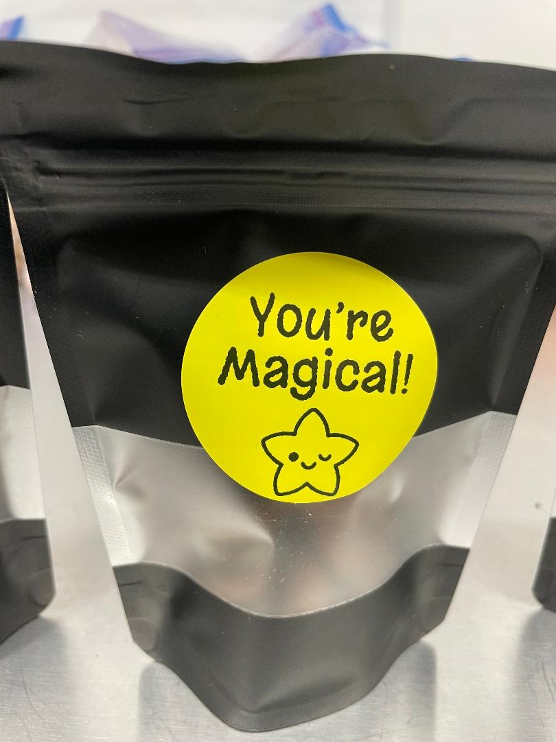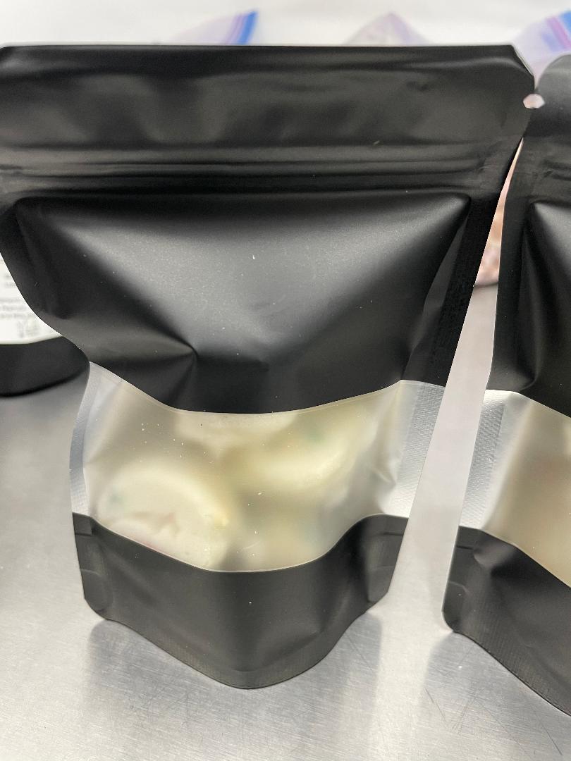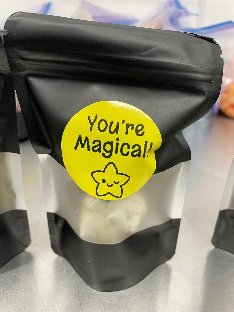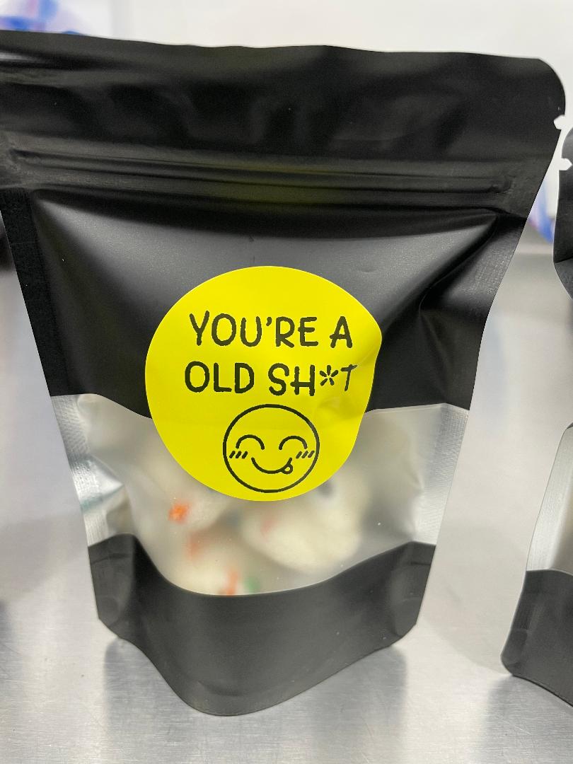 Freeze dried Milk Chocolate Frosting, Strawberry Frosting or Rainbow Chip Frosting. 4 lil poops with various sayings.